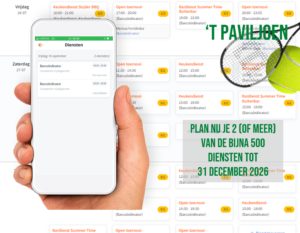 Het inplannen van de bardienst kan via tvdd.nl als je bent ingelogd. Of via de KNLTB Clubapp op je android of I phone.
